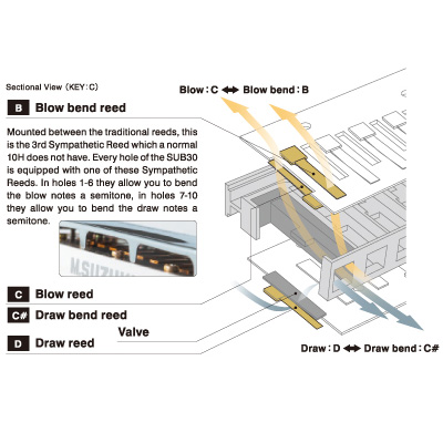 Klasszikus 10 hanglyukú, diatonikus szájharmonikán kromatikus (fél hangokat is tartalmazó) skálát kijátszani eddig kizárólag az igen nehéz és bonyolult, ún. "overblow/overdraw" (túlfújásos) technika elsajátításával lehetett. A Suzuki új SUB30 Ultra Bend speciális kialakítású, 10 hanglyukú szájharmonikája lehetővé teszi, hogy az egyszerűbben elsajátítható "hajlítás" technikájának helyes alkalmazásával, teljes kromatikus skála is kijátszható legyen a hangszeren, ezáltal több zenei műfajban (jazz, pop, klasszikus zene és természetesen a blues) és szélesebb zenei környezetben is jól használható. A normál 10 hanglyukú, diatonikus szájharmonikákon általában 8 hangot tudunk hajlítás technikájával kijátszani, míg a forradalmian új Suzuki SUB30 Ultra Bend harmonikán 18-at! Természetesen a hajlítás technikájának helyes elsajátítását követően, de nincs szükség a nehéz, "overblow/overdraw" (túlfújásos) technika megtanulására, alkalmazására. Kizárólag "normál" hajlítással kijátszható az összes félhang. Az új Suzuki SUB30 Ultra Bend szájharmonika új dimenziókat nyithat, valamint kreatív játéktechnika lehetőségét nyújthatja a szájharmonikázásban. |