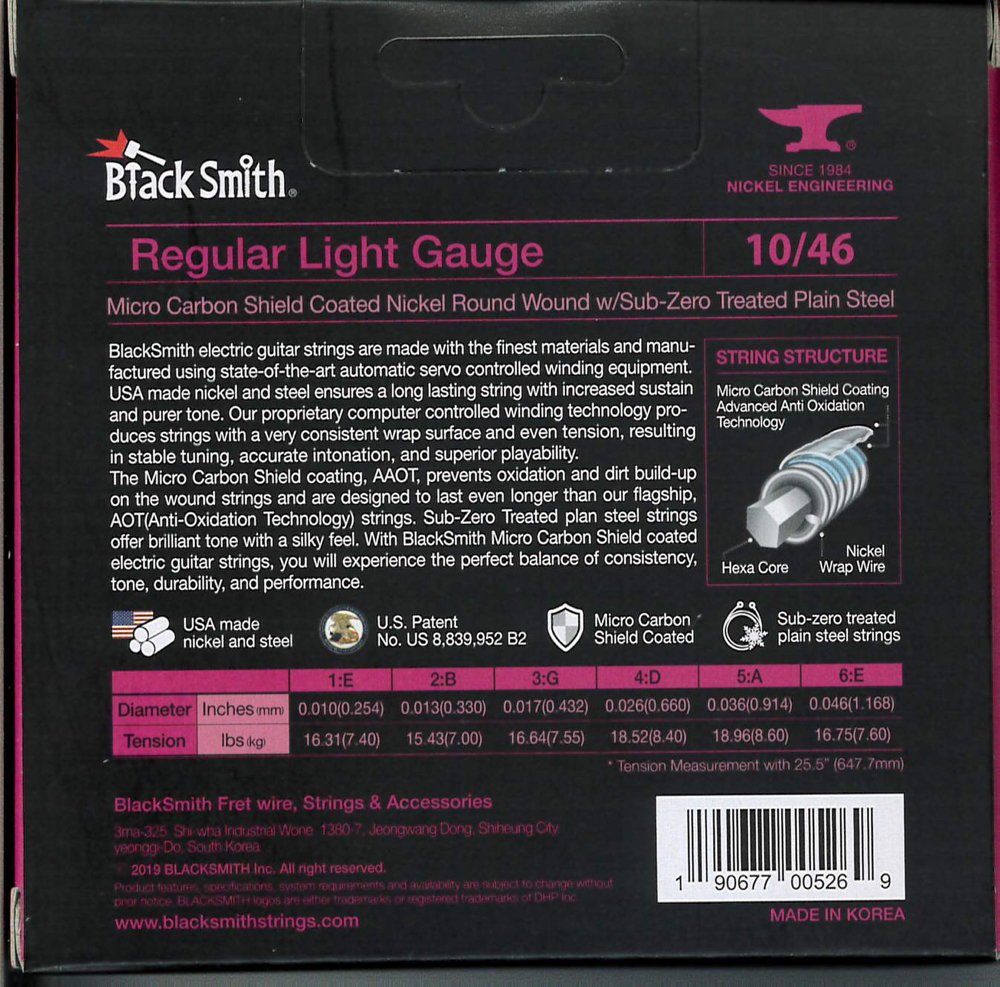 A BlackSmith elektromos gitár húrok a legkiválóbb alapanyagokból készülnek a legmodernebb tekercselő berendezés használatával. Az USA-ban gyártott nikkel és acél hosszú élettartamot és megnövelt hangkitartást biztosít. Számítógépvezérelt technológiával egyenletes tekercselést és húrnyomást kapunk, ami stabil hangolást, pontos intonációt és kiváló játszhatóságot eredményez.