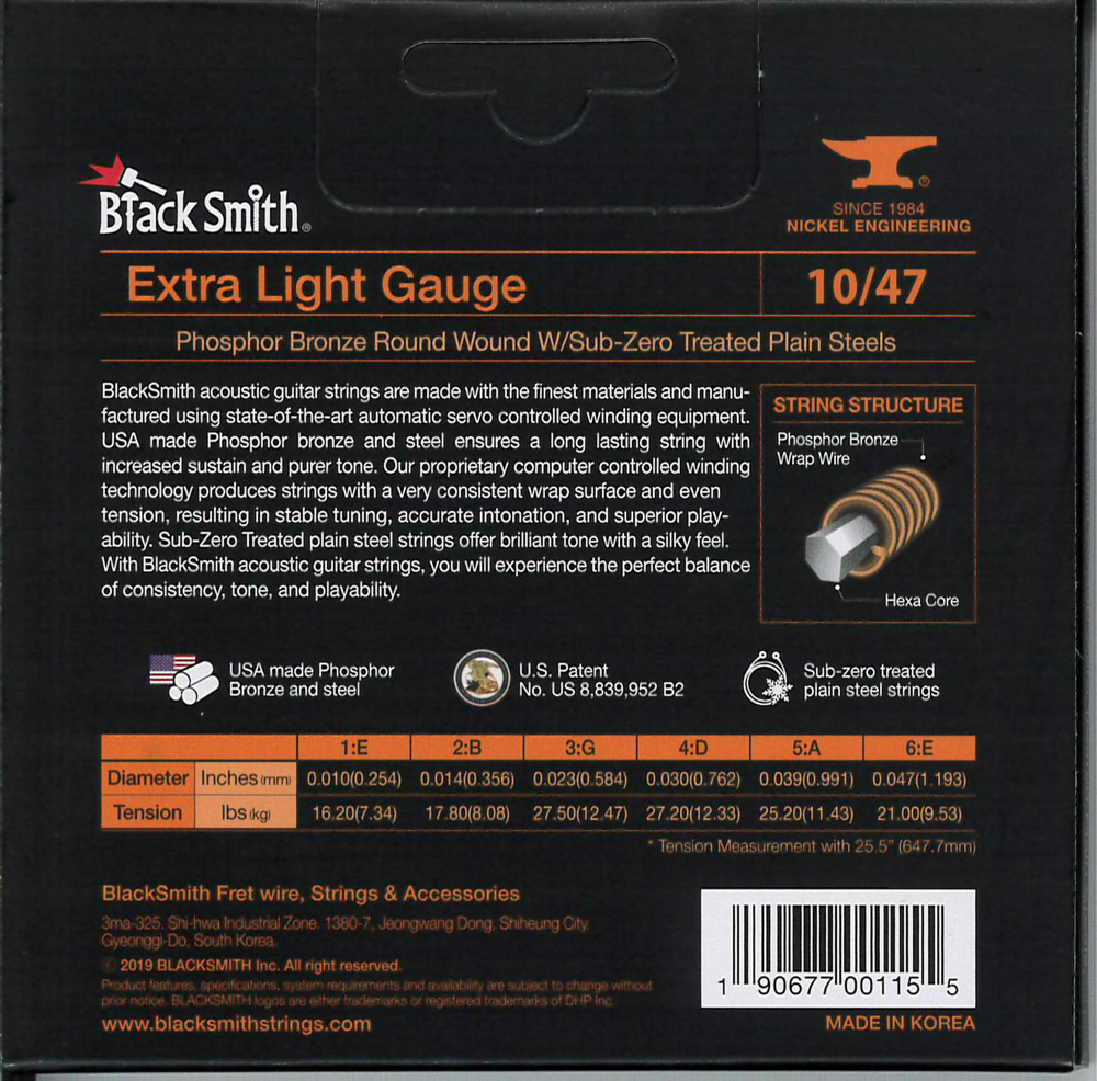 PB-1047 - A BlackSmith Extra Light akusztikus foszfor-bronz húrkészlete, ideális kezdőknek és minden olyan zenésznek, akik a nagyszerű, meleg hangzást, a csilingelő magasakat és maximális húrrugalmasságot kedvelik, könnyű játszhatósággal és magas szintű hangprojekcióval.